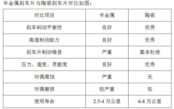 (1)陶瓷剎車片與半金屬剎車片最大差別是沒有金屬。半金屬剎車片中金屬是主要產(chǎn)生摩擦力的材料,制動力大,但是磨損大,而且易出現(xiàn)噪音。安裝陶瓷剎車片后,在正常行駛中,不會產(chǎn)生異常尖叫。因為陶瓷剎車片中不含金屬成份,所以就避免了類似半金屬剎車片與對偶件(即剎車片與剎車盤)相互磨擦的金屬尖叫聲。
